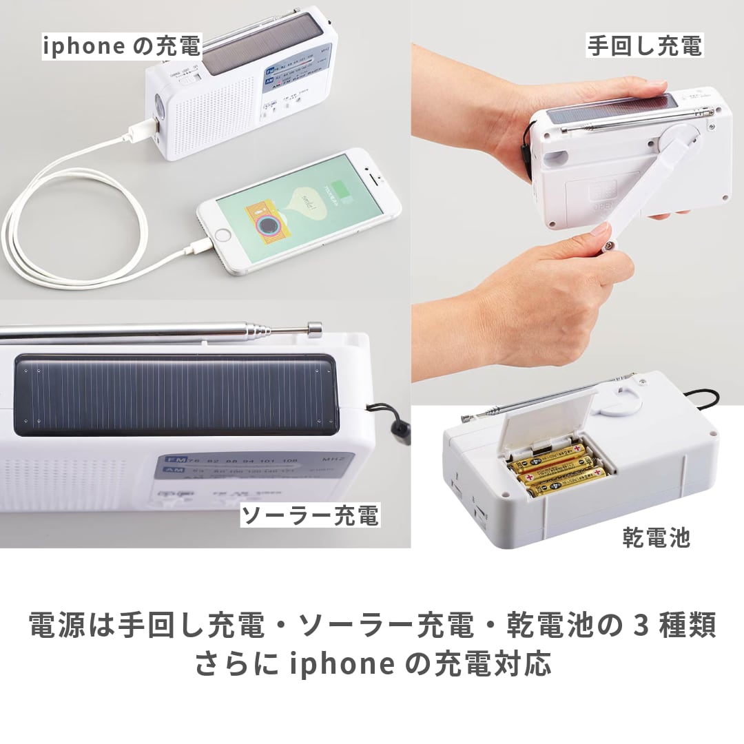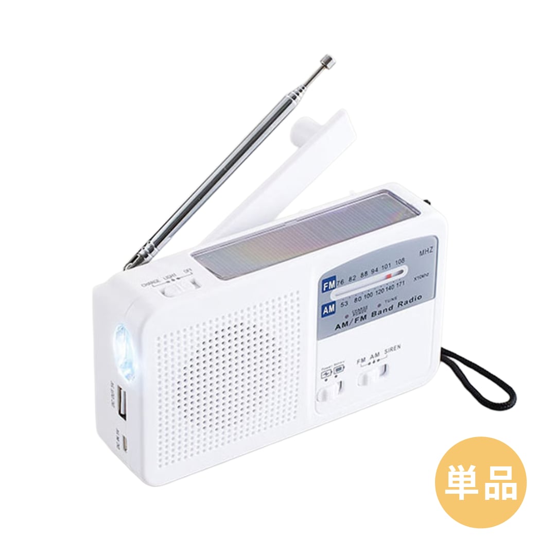 LEDライト、ラジオ(AM・FM/ワイドFM)、サイレン、スマホ携帯電話充電