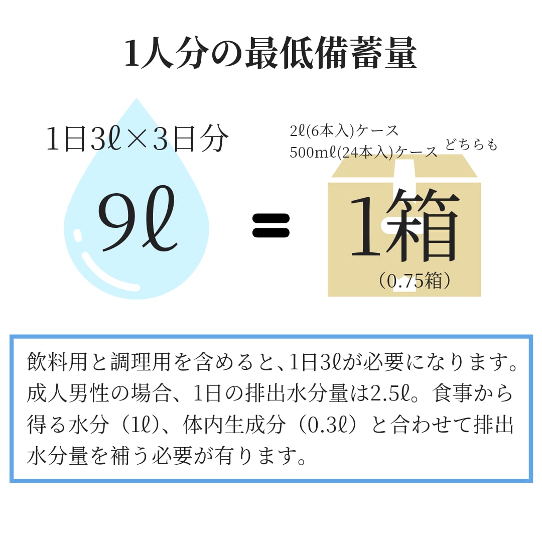 ミネラル分を除去した純水です。災害時の飲料用水としてはもちろん、赤ちゃんのミルクづくりや調理など幅広い用途でお使いいただけます。