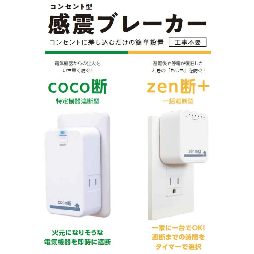 coco断(ココダン)は震度5強相当以上の強い揺れを感知すると、自動で当製品内の通電を遮断する感震ブレーカーです。コンセントに差し込むだけで簡単に設置することができる、特定遮断タイプの感震ブレーカーです。