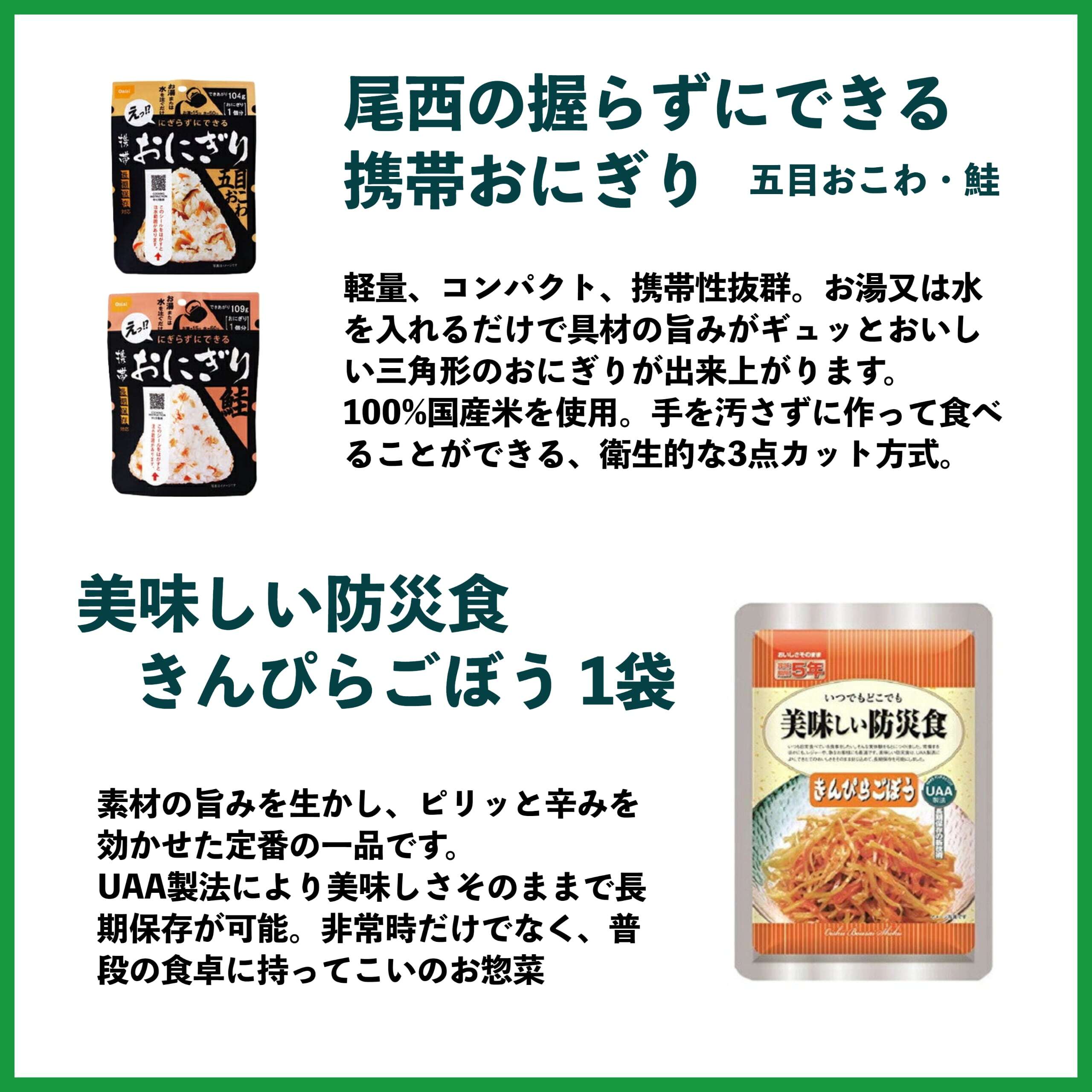 セットには水やお湯でできる国産米使用のおにぎりを2種類。